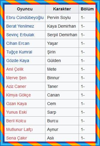 بازیگران : Cemre Baysel, Burak Çelik, Ebru Cündübeyoğlu, Sevinç Erbulak, Cem Kurtoğlu, Berat Yenilmez, Ozan Kaya Oktu, Beril Kolcu, Merve Şen, Bahar Süer, Tuğçe Kumral, Gözde Kaya, Yunus Eski, Anıl Çelik, Mehmet Cihan Ercan, Aziz Caner İnan, Sena Çakır و سایر بازیگران و بازیگرانه میهمان*